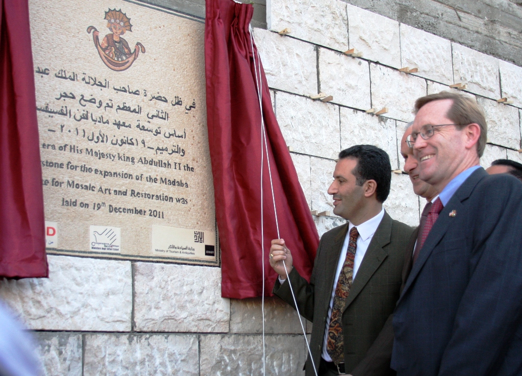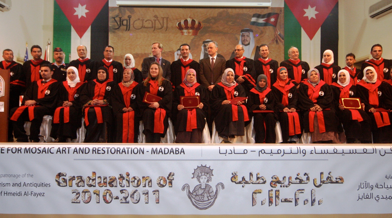 The foundation stone for a planned expansion of the Madaba Institute of Mosaic Art and Restoration (MIMAR) was laid last month at a ceremony during which the class of the 2010/2011 term were officially also graduated. The institute is set to become a regional center of excellence in mosaic art and stone restoration. This development is being supported by the USAID Jordan Tourism Development Project (Siyaha) and the Italian Cooperation for Development Office - Embassy of Italy in Amman, which have contributed extensively to the development of the institute and its bid to provide students with the skills needed to help preserve Jordan’s mosaic heritage. The event was held under the patronage of H.E. Nayef Humeidi Al-Fayez, Minister of Tourism and Antiquities.